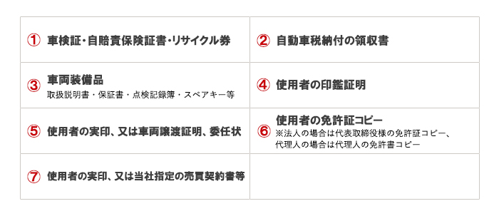 当店で金融車を売却する際に必要な書類は、一般的な業者様と共通ですが下記の書類が必要になります。※お車の使用者が自分でないなど特殊なケースの場合は、追加書類が必要になる場合がございます。必要書類についてはお取引の流れページの必要書類にて、より詳しく解説しておりますので、是非ご参照ください。